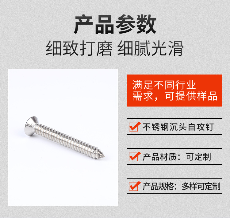 标准:常见的有国标(GB/T)、德标(DIN)、美标(ANSI/ASME)等。例如,DIN 7981 就是专门针对沉头自攻螺钉的标准。