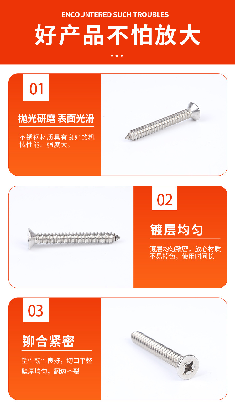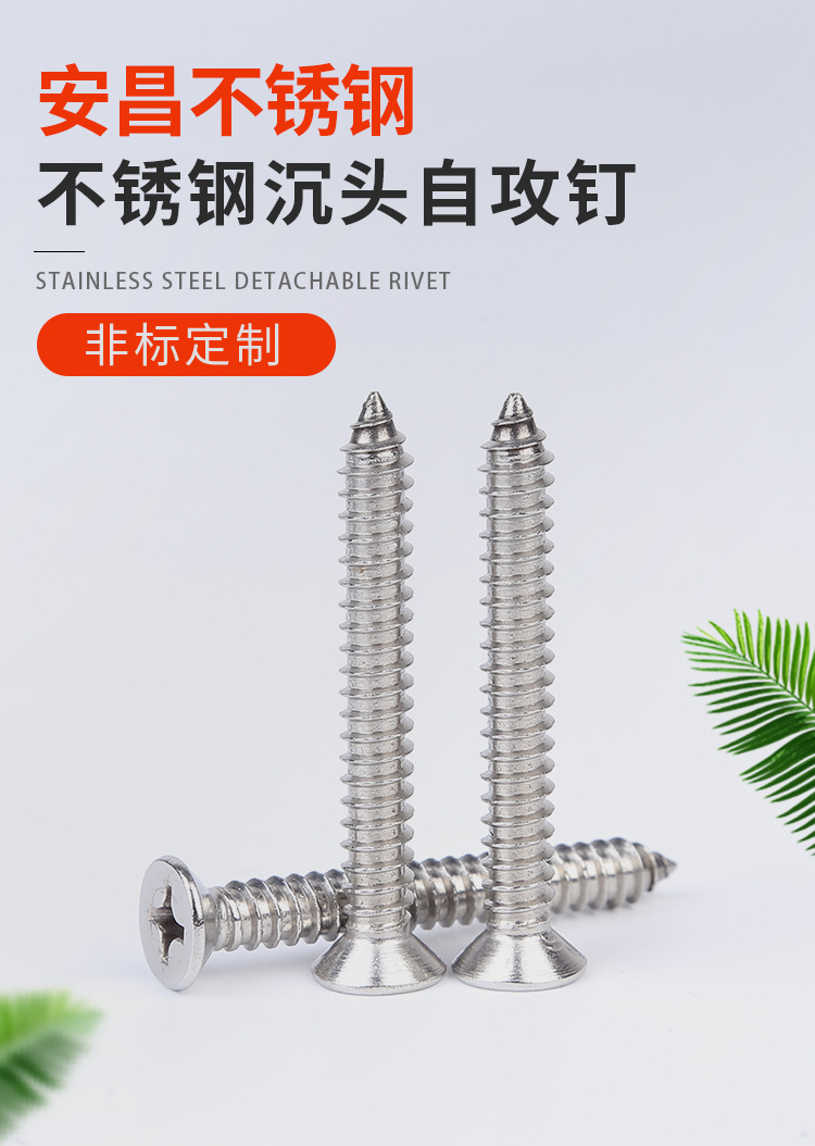 综上,不锈钢沉头自攻钉就是一种由不锈钢制成、头部可沉入工件内部、能够自己攻出螺纹的螺钉。
